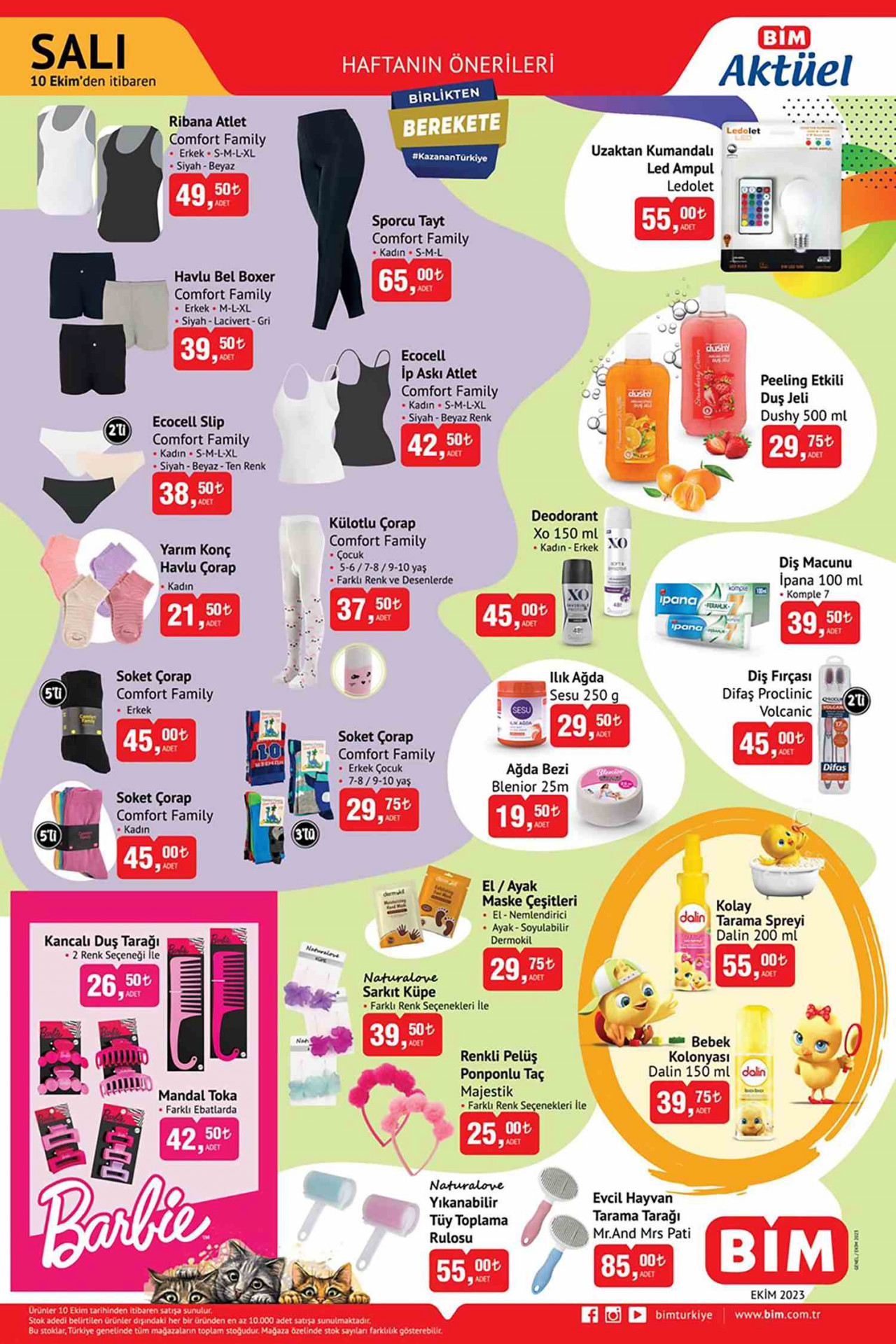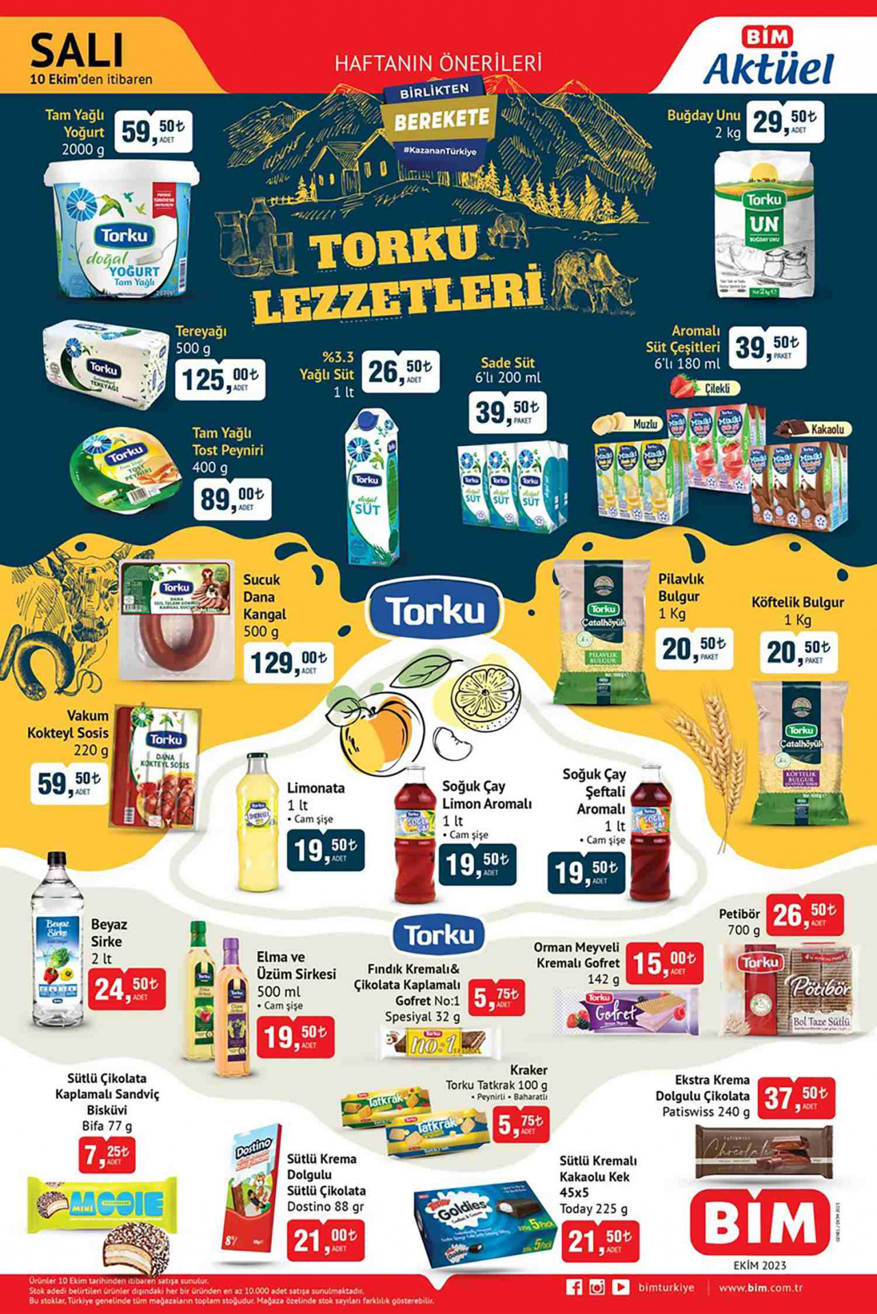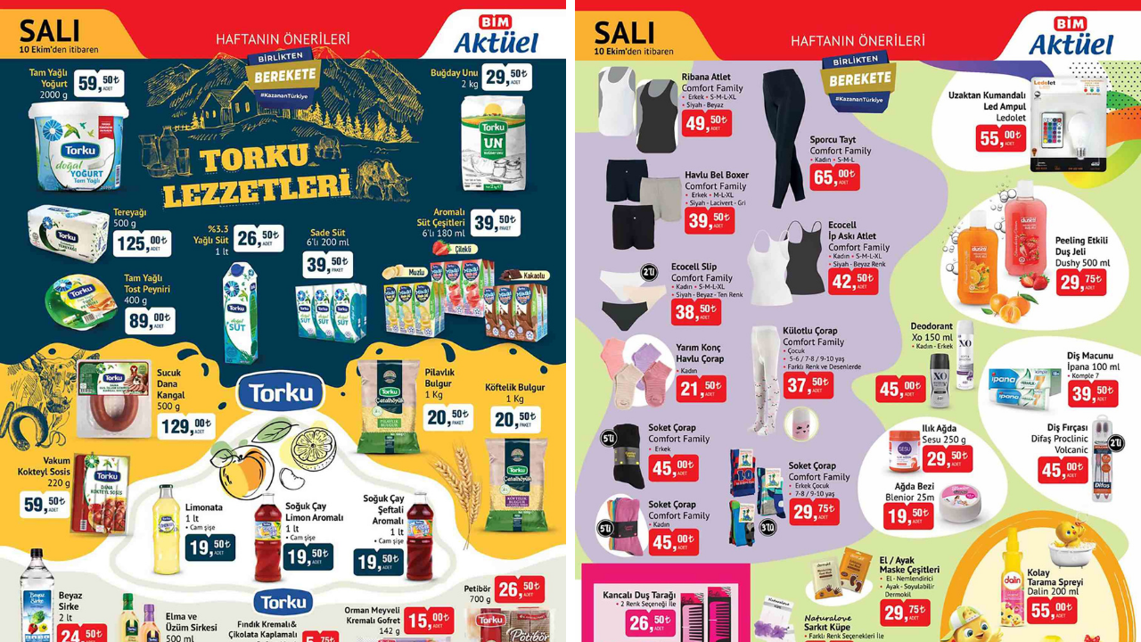 BİM, 10 Ekim 2023 Salı gününden itibaren geçerli olacak haftanın önerileri kataloğunu duyurdu. BİM’de bu hafta, iç giyim, kişisel bakım, temizlik ve hijyen, takı ve aksesuar, donmuş gıdalar, Torku ürünleri, içecekler, süt ve süt ürünleri, çerezler, atıştırmalık gibi birçok ürün grubunda indirimli fiyatlar sizleri bekliyor.