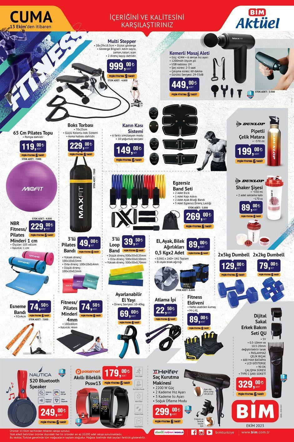 Bim aktüel ürünler kataloğunun ilk sayfasında spor malzemelerinde fiyatlar düştü. Bu sayfada Multi Stepper, kemerli masaj aleti, pilates topu, boks seti, karın kası sistemi, egzersiz bant seti, pipetli çelik matara, shaker şişesi, fitness pilates minderi, el-ayak-bilek ağırlıkları, dumbell seti, esneme bandı, fitness eldiveni gibi ürünler indirimli fiyatlarla sunuluyor.
