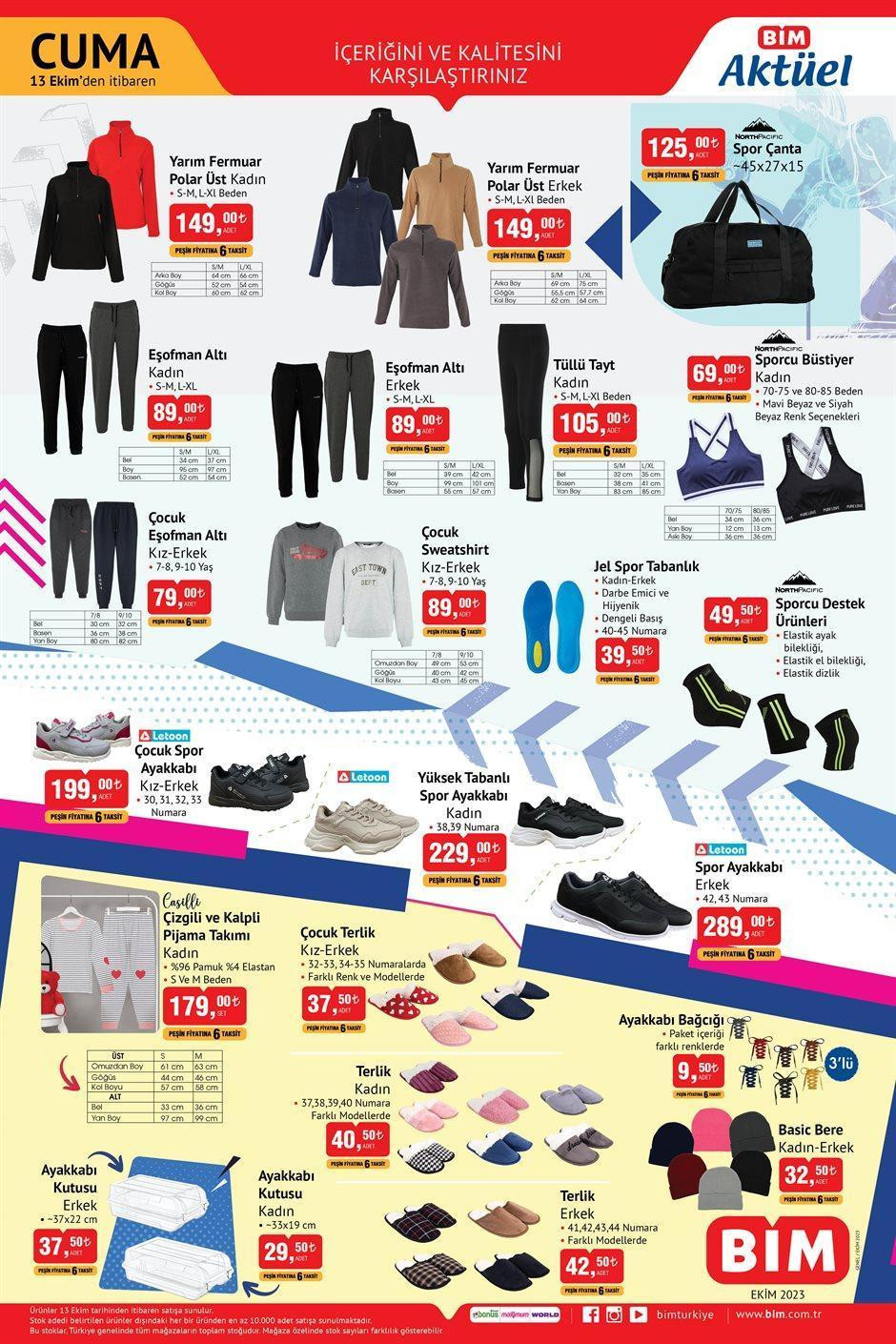 Bim aktüel ürünler kataloğunun beşinci sayfasında ise spor ve tekstil ürünlerinde şık seçenekler yer alıyor. Bu sayfada kadın eşofman altı, erkek eşofman altı, kadın tayt, sporcu büstiyer kadın, erkek ve kız çocuk eşofman altı, çocuk Sibel tişört kız veya erkek, jel spor ayakkabılık gibi ürünler indirimli fiyatlarla sunuluyor.