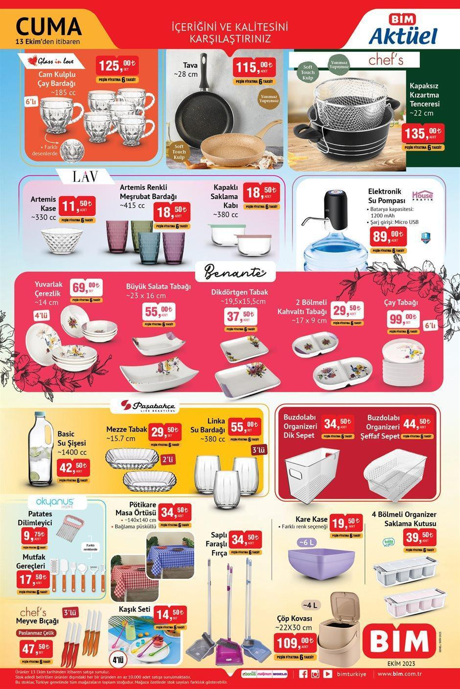 Bim aktüel ürünler kataloğunun üçüncü sayfasında ise mutfak eşyasında şık ve kaliteli ürünler yer alıyor. Bu sayfada Glass in love markasının cam kulplu çay bardağı seti, döküm tava ve kapaksız kızartma tenceresi, Lav markasının artemis kase ve renkli meşrubat bardağı, saklama kabı kapaklı seti, elektronik su pompası, yuvarlak çerezlik şık ve ergonomik yapısıyla dikkat çekiyor.