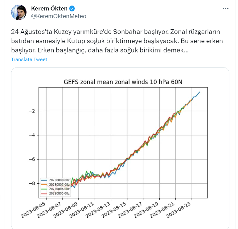 Kuzey yarım kürede sonbaharın 24 Ağustos'ta başladığını ifade eden Ökten, zonal rüzgarların batıdan eseceğinin altını çizdi. Bu noktada kutuplarda soğuk birikmesi yaşanacağını ifade eden uzman isim, kış mevsiminin de bu sene erken başladığına değindi. Zonal rüzgarın erken başlamasına daha fazla soğuk birikmesinin işareti olduğunu söyledi.
