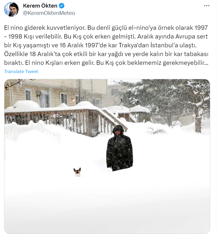 Sosyal medya hesabı Twitter üzerinden önemli paylaşımlarda bulunan meteoroloji uzmanı Kerem Ökten, peş peşe yayınladığı 3 tweet ile Türkiye'nin meteorolojik olaylarını sıraladı. El Nino'nun giderek kuvvetlendiğini ifade eden uzman isim, bu denli güçlü bir El Nino'nun 1997-1998 kışına benzediğinin altını çizdi. Bu yıllar arasında kışın erken başladığını söyleyen Ökten, Aralık ayında Avrupa'da sert bir kış yaşandığını söyledi. 16 Aralık 1997 tarihinde ar yağışının Trakya'dan İstanbul'a geçiş yaptığını ifade eden Kerem Ökten, “Özellikle 18 Aralık'ta çok etkili bir kar yağdı ve yerde kalın bir kar tabakası bıraktı. El nino Kışları erken gelir. Bu Kış çok beklememiz gerekmeyebilir…” açıklamalarında bulundu.