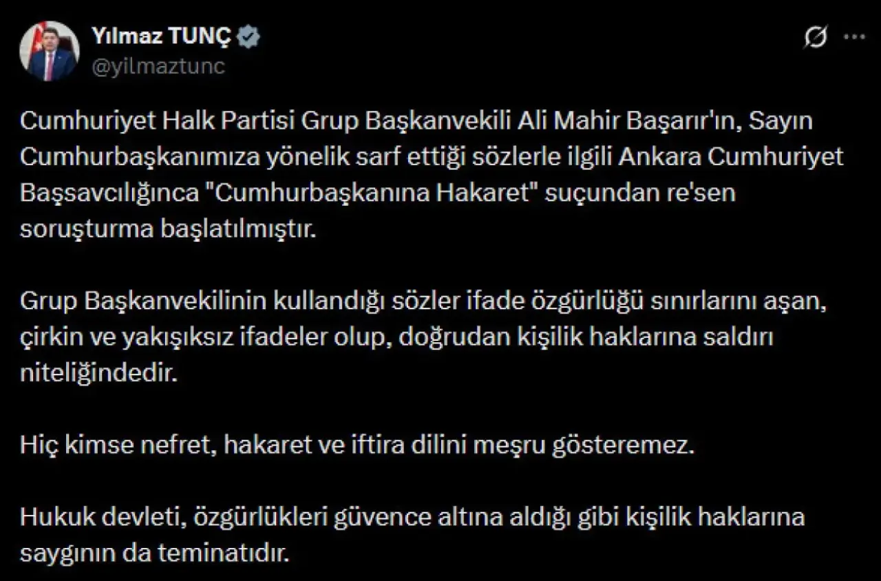 Adalet Bakanı Yılmaz Tunç, CHP Grup Başkanvekili Ali Mahir Başarır'ın Cumhurbaşkanı Recep Tayyip Erdoğan'a yönelik sözler nedeniyle Ankara Cumhuriyet Başsavcılığı'nın re'sen soruşturma başlattığını resmen açıkladı.
