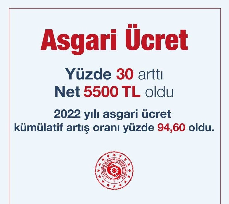 Çalışma ve Sosyal Güvenlik Bakanı Vedat Bilgin, ''Çalışanlarımızı, emekçilerimizi enflasyona ezdirmeme irademizin arkasındayız. Bugün itibariyle ek %30’luk artış yaparak asgari ücreti 5.500 TL’ye çıkardık. Böylelikle 2022 yılında asgari ücretteki kümülatif artış oranı %94.60 oldu. Hayırlı olsun.'' ifadelerini kullandı.