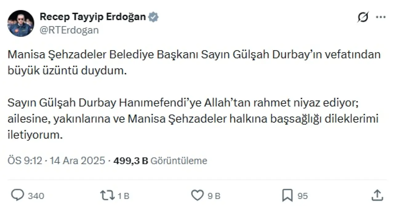 Sosyal medya hesabından bir paylaşım yayımlayan Cumhurbaşkanı Erdoğan, “Manisa Şehzadeler Belediye Başkanı Sayın Gülşah Durbay’ın vefatından büyük üzüntü duydum. Sayın Gülşah Durbay Hanımefendi’ye Allah’tan rahmet niyaz ediyor; ailesine, yakınlarına ve Manisa Şehzadeler halkına başsağlığı dileklerimi iletiyorum.” ifadelerini kullandı.