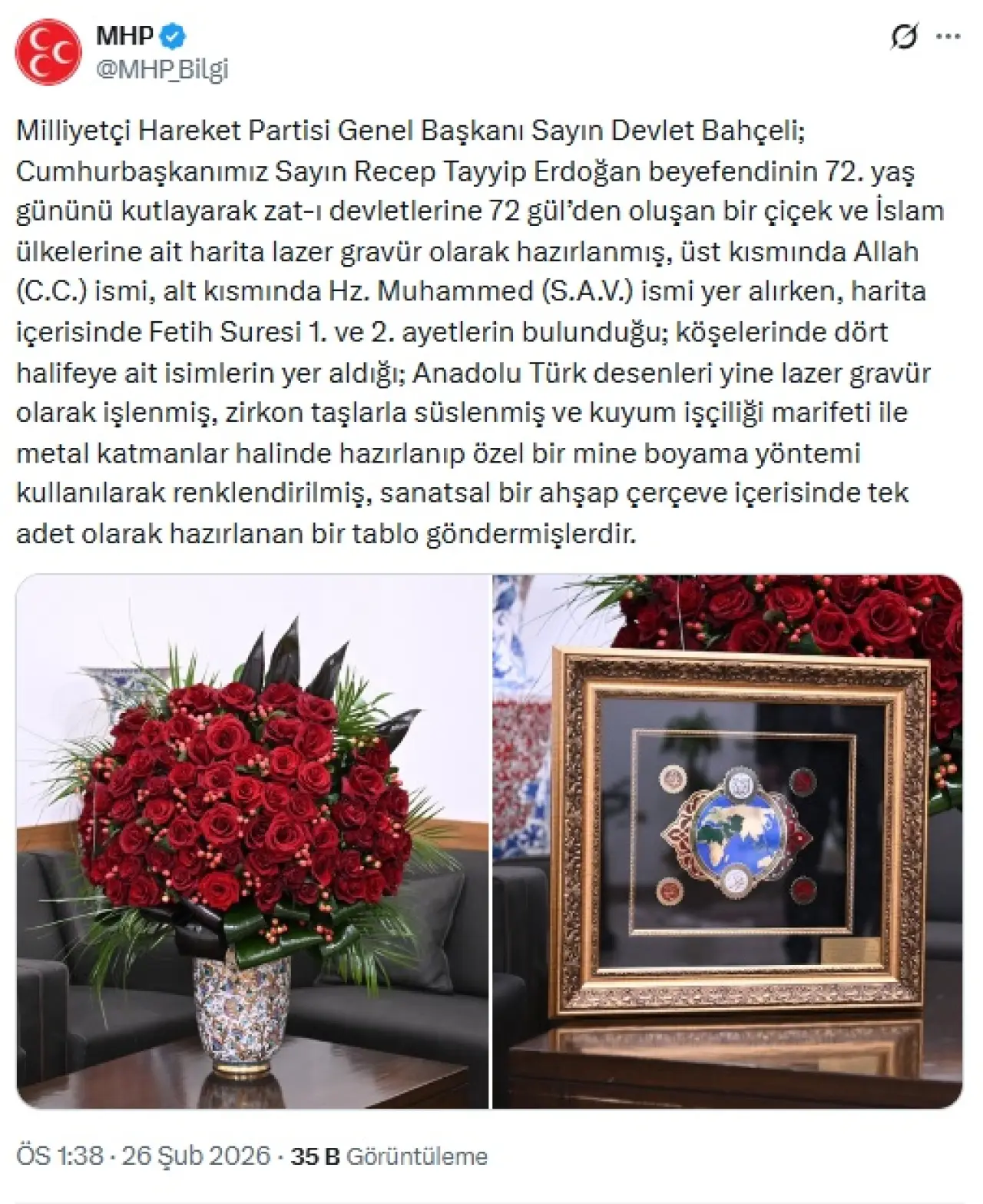 Milliyetçi Hareket Partisi (MHP) Genel Başkanı Devlet Bahçeli, Cumhurbaşkanı Recep Tayyip Erdoğan’ın 72’nci yaş gününü özel bir kutlama mesajı ve sanatsal bir hediye ile kutladı.