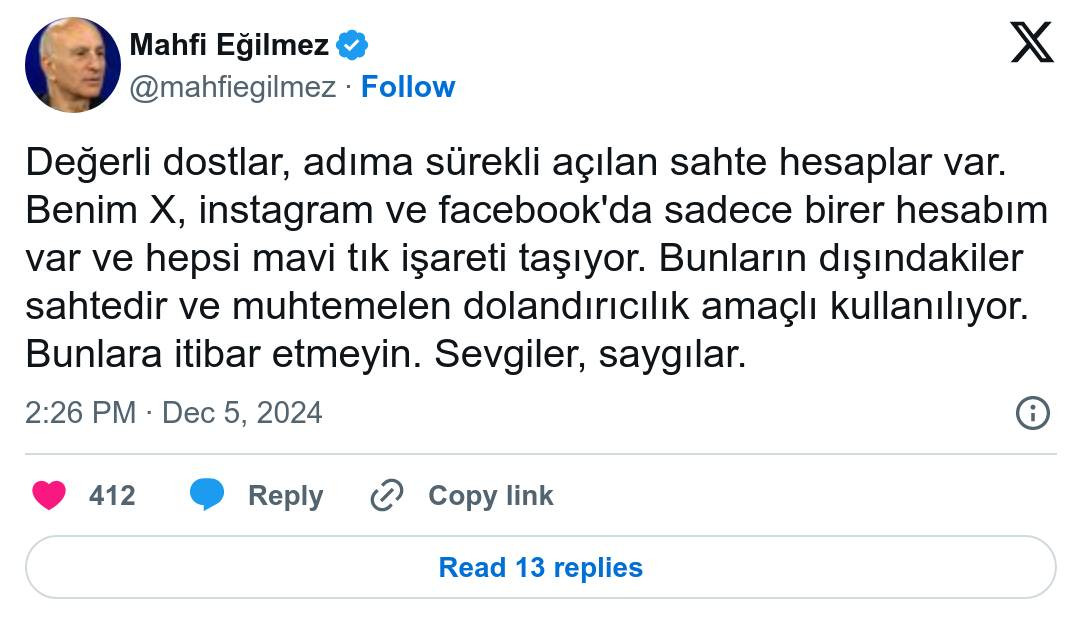 Dolandırıcılar ünlü isimleri taklit ederek vatandaşları ağına düşürmeye çalışıyor. Bir süreden beri dolandırıcıların adını kullandığı iktisatçı Mahfi Eğilmez adına sürekli sahte hesaplar açıldığını anımsattı. Eğilmez, “Bunlara itibar etmeyin.” dedi.