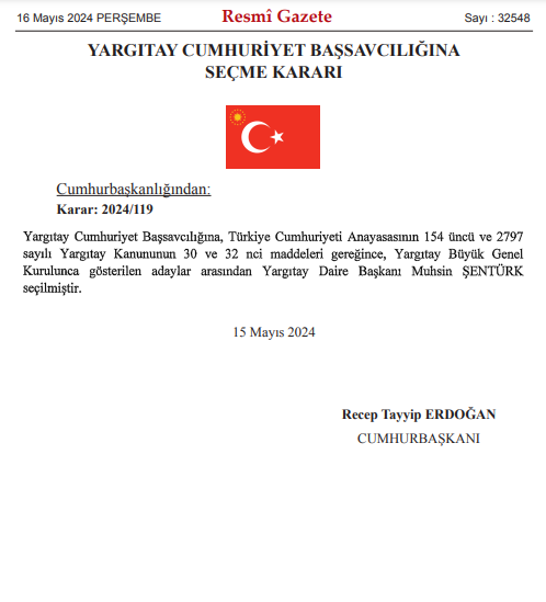 Muhsin Şentürk’ün Yargıtay Cumhuriyet Başsavcılığına seçilmesine ilişkin Cumhurbaşkanı kararı, 16 Mayıs 2024 Tarihli ve 32548 Sayılı Resmi Gazete’de yayımlandı.