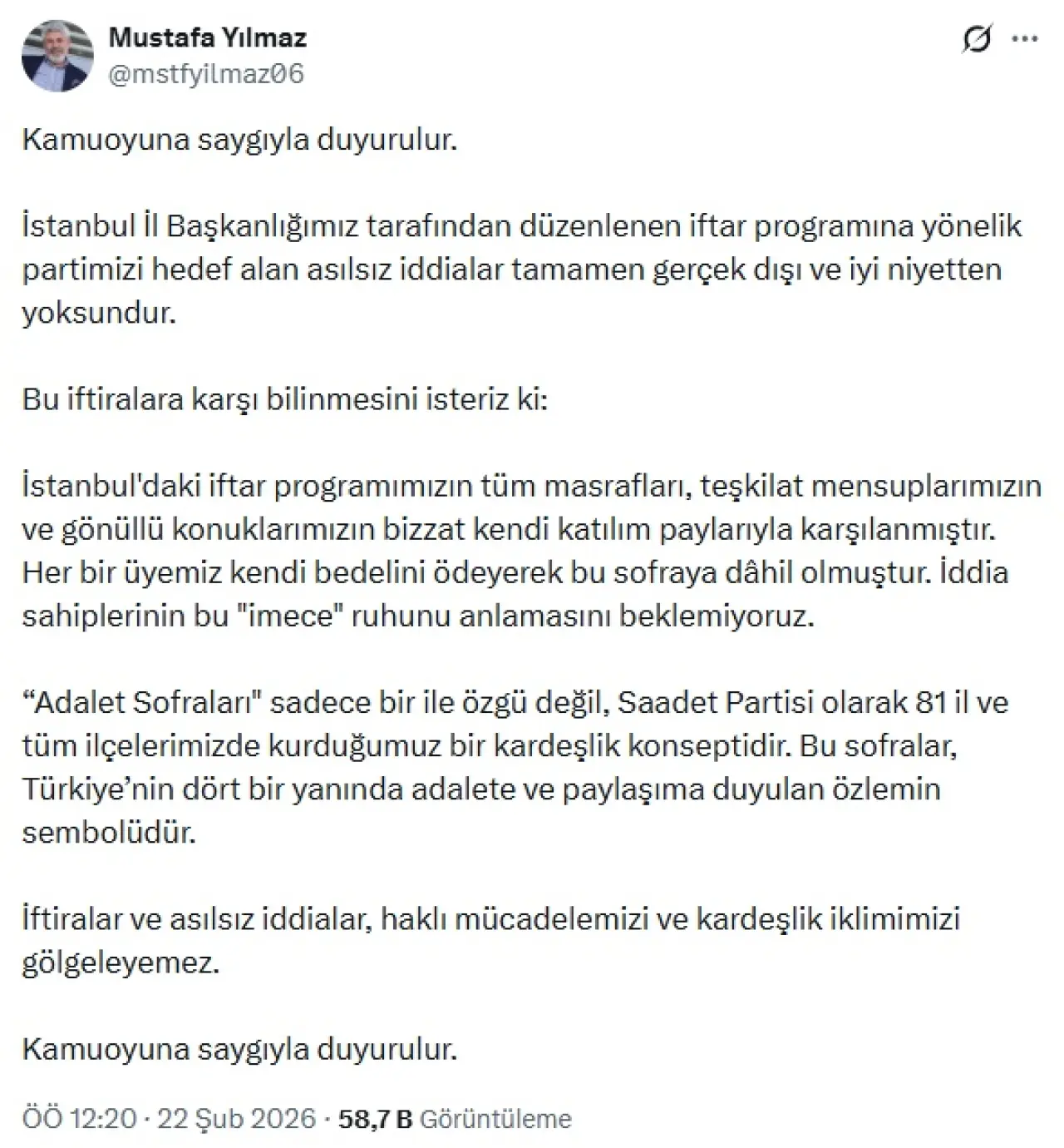 “İstanbul İl Başkanlığımız tarafından düzenlenen iftar programına yönelik partimizi hedef alan asılsız iddialar tamamen gerçek dışı ve iyi niyetten yoksundur. Bu iftiralara karşı bilinmesini isteriz ki: İstanbul'daki iftar programımızın tüm masrafları, teşkilat mensuplarımızın ve gönüllü konuklarımızın bizzat kendi katılım paylarıyla karşılanmıştır. Her bir üyemiz kendi bedelini ödeyerek bu sofraya dâhil olmuştur. İddia sahiplerinin bu "imece" ruhunu anlamasını beklemiyoruz. “Adalet Sofraları" sadece bir ile özgü değil, Saadet Partisi olarak 81 il ve tüm ilçelerimizde kurduğumuz bir kardeşlik konseptidir. Bu sofralar, Türkiye’nin dört bir yanında adalete ve paylaşıma duyulan özlemin sembolüdür. İftiralar ve asılsız iddialar, haklı mücadelemizi ve kardeşlik iklimimizi gölgeleyemez. Kamuoyuna saygıyla duyurulur.”