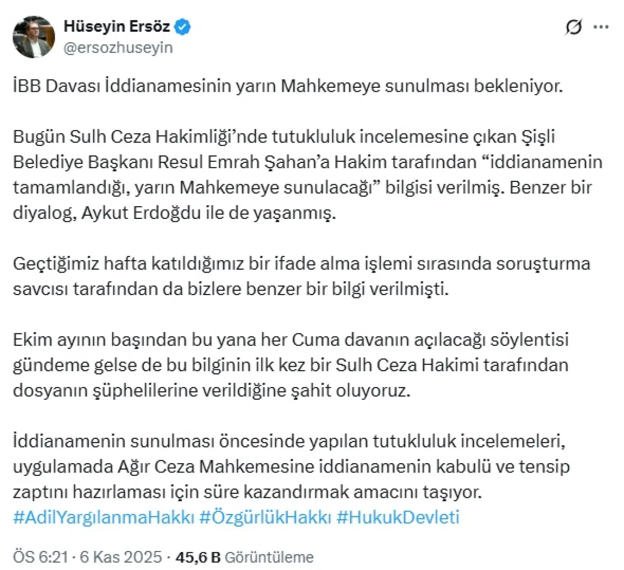 Avukat Hüseyin Ersöz, tutuklu İstanbul Büyükşehir Belediye Başkanı Ekrem İmamoğlu'na yönelik yürütülen “çıkar amaçlı suç örgütü” soruşturması kapsamında hazırlanan iddianamenin yarın mahkemeye sunulmasının beklendiğini öne sürdü. Ersöz, sosyal medya hesabından yaptığı paylaşımda, “İBB Davası İddianamesinin yarın mahkemeye sunulması bekleniyor. Bugün Sulh Ceza Hakimliği'nde ifade veren müvekkillerimize bu bilgi Sulh Ceza Hakimi tarafından verildi” ifadelerini kullanarak, bilgiyi hakimden aldıklarını belirtti. Ancak İstanbul Cumhuriyet Başsavcılığı, kısa süre sonra yaptığı açıklamada, “İBB yolsuzluk iddianamesinin yarın mahkemeye sunulacağı yönündeki paylaşım ve haberler gerçeği yansıtmamaktadır.” diyerek iddiayı yalanladı.