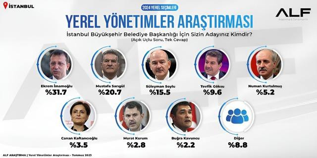 'İstanbul Büyükşehir Belediye Başkanlığı için sizin adayınız kimdir?' sorusunun yöneltildiği, 17-20 Temmuz 2023 tarihleri arasında 2 bin 750 kişi ile yapılan araştırmada dikkat çeken isimler yer aldı.