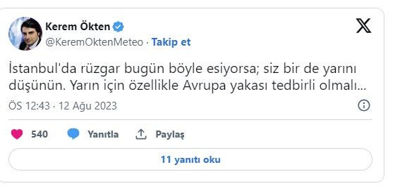 Gün içerisinde yine uyarılarda bulunan Kerem Ökten, bugün esen rüzgarın vatandaşlara yarının habercisi olacağını aktardı. Bununla alakalı olarak da, “İstanbul'da rüzgar bugün böyle esiyorsa; siz bir de yarını düşünün. Yarın için özellikle Avrupa yakası tedbirli olmalı...” ifadelerine yer verdi.