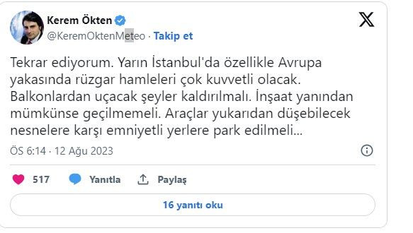Ökten, özellikle de İstanbul Avrupa Yakasında ikamet edenleri uyarırken, “Tekrar ediyorum. Yarın İstanbul'da özellikle Avrupa yakasında rüzgar hamleleri çok kuvvetli olacak. Balkonlardan uçacak şeyler kaldırılmalı. İnşaat yanından mümkünse geçilmemeli. Araçlar yukarıdan düşebilecek nesnelere karşı emniyetli yerlere park edilmeli..” dedi.