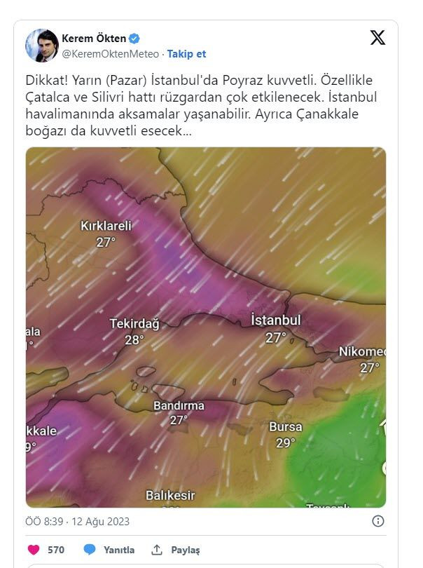 “Dikkat! Yarın (Pazar) İstanbul'da Poyraz kuvvetli. Özellikle Çatalca ve Silivri hattı rüzgardan çok etkilenecek. İstanbul havalimanında aksamalar yaşanabilir. Ayrıca Çanakkale boğazı da kuvvetli esecek...”