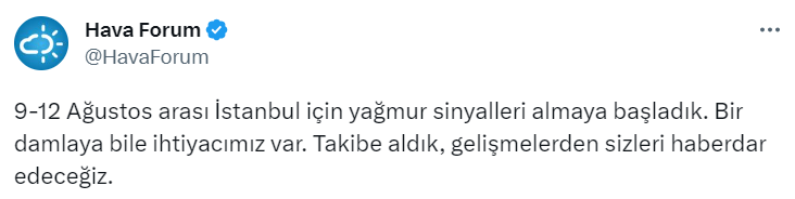Meteoroloji paylaşımlarında bulunan Hava Forum Twitter sayfası, 9 ile 12 Ağustos arasında İstanbul'da yağmur beklendiğini açıkladı.