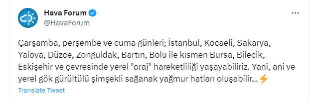 "Çarşamba, perşembe ve cuma günleri; İstanbul, Kocaeli, Sakarya, Yalova, Düzce, Zonguldak, Bartın, Bolu ile kısmen Bursa, Bilecik, Eskişehir ve çevresinde yerel "oraj" hareketliliği yaşayabiliriz. Yani, ani ve yerel gök gürültülü şimşekli sağanak yağmur hatları oluşabilir..."