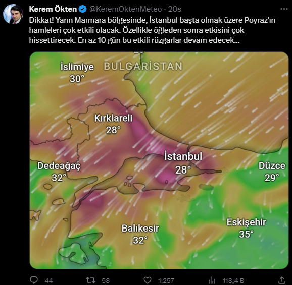 Meteoroloji uzmanı Kerem Ökten, sosyal medya platformundan "Önemli Uyarı" etiketiyle önemli bir duyuru yaptı. Ökten, Marmara Bölgesi'nde özellikle İstanbul başta olmak üzere Kocaeli, Sakarya, Yalova, Bursa ve Düzce illerinde önümüzdeki en az 10 gün süresince yoğun poyraz rüzgarlarının etkisini göstereceğini bildirdi.