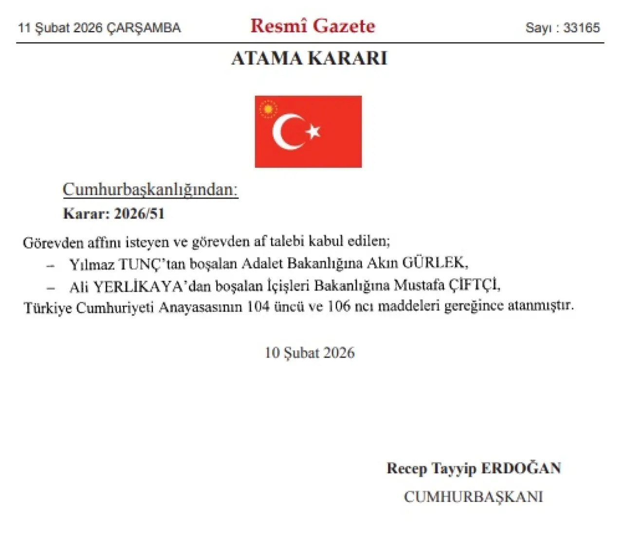 Resmi Gazete’de 11 Şubat 2026 tarihinde yayımlanan atama kararlarıyla Cumhurbaşkanlığı Kabinesi’nde beklenen revizyon gerçekleşti. İçişleri Bakanı Ali Yerlikaya ve Adalet Bakanı Yılmaz Tunç’un “görevden af taleplerinin” kabul edilmesiyle boşalan koltuklara sürpriz isimler atandı.