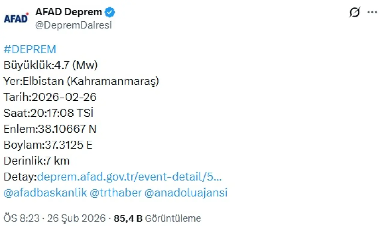 “Kahramanmaraş ilimizin Elbistan ilçesinde saat 20.17’de meydana gelen 4.7 büyüklüğündeki #deprem sonrası, an itibarıyla, olumsuz bir durum bulunmamaktadır. Saha tarama çalışmaları devam etmektedir. Etkilenen vatandaşlarımıza geçmiş olsun dileklerimizi sunarız.”