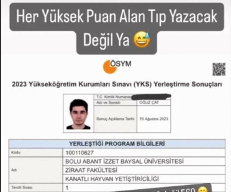 “Tıp, diş hekimliği, eczacılık ya da hukuk gibi bir bölümü yazarak insanların önüne geçip haklarını Yemek istemedim. Bu sebeple kontenjanı boş kalan ve fazla tercih edilmeyen lisans bölümlerini araştırdım. Ayrıca ilginç, pek duyulmamış ve espri konusu olabilecek bir bölüm yazmak istedim. Karşıma, Bolu Abant İzzet Baysal Üniversitesi’nin Kanatlı Hayvan Yetiştiriciliği bölümü çıktı. Terk tercih yaparak orayı yazdım ve yerleştim. Ancak kayıt yaptırmayacağım. Çünkü tıp öğrenimini bırakmayı düşünmüyorum.