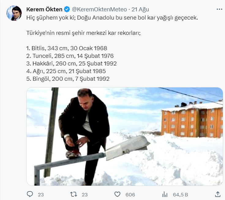 Meteoroloji uzmanı Kerem Ökten, resmi Twitter hesabından yaptığı paylaşımla Doğu Anadolu bölgesini uyardı. 1968 kışında kırılan kar yağış rekorunun tekrarlanacağını belirten Ökten, bölgenin kara doyacağını aktardı. İşte, Kerem Ökten'in o paylaşımı:
