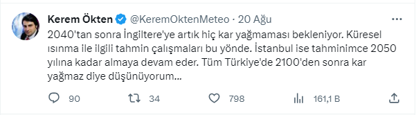 Ökten, sosyal medya hesabından yaptığı açıklamada, "İstanbul tahminimce 2050 yılına kadar kar almaya devam eder. Tüm Türkiye'de ise 2100'den sonra kar yağmaz diye düşünüyorum..." ifadesini kullandı. Bu sözleriyle gelecekte kar yağışının azalabileceğine dikkat çekiyor ve iklim değişikliğinin olası etkilerini öne sürüyor.