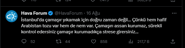 "İstanbul'da çamaşır yıkamak için doğru zaman değil... Çünkü hem hafif Arabistan tozu var hem de nem var. Çamaşırı assan kurumaz, sürekli kontrol edersiniz çamaşır kurumadıkça strese girersiniz..."