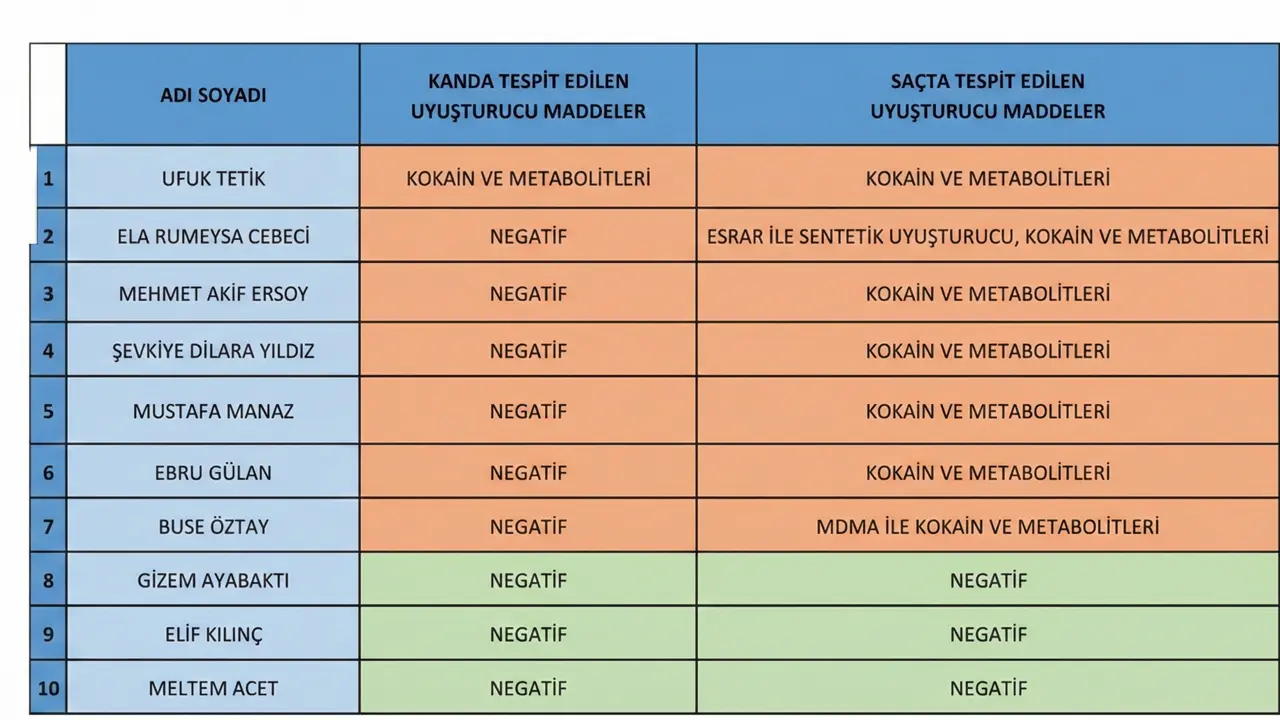 Emniyetteki işlemlerinin ardından tutuklanan isimlerin test sonuçları şöyle: