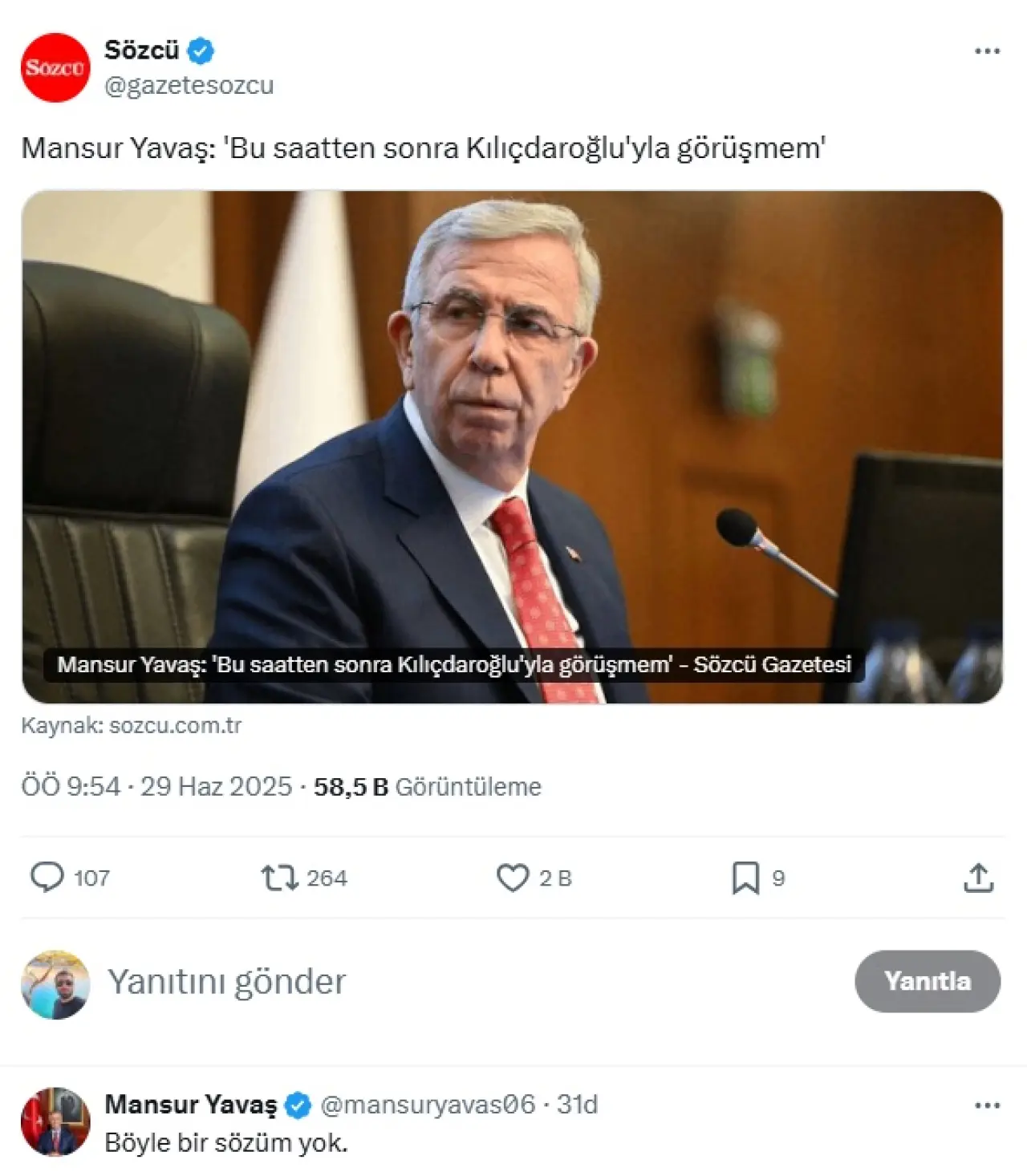 Mansur Yavaş, Sözcü’nün sosyal medya paylaşımına cevap vererek, “Böyle bir sözüm yok” dedi.