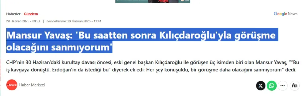 Sözcü gazetesi, kurultay davası öncesi, bir önceki genel başkan Kemal Kılıçdaroğlu ile geçtiğimiz günlerde görüşen 3 isimden biri olan Ankara Büyükşehir Belediye Başkanı Mansur Yavaş’ın ‘Bu saatten sonra Kılıçdaroğlu’yla görüşmem’ dediğini iddia etti.