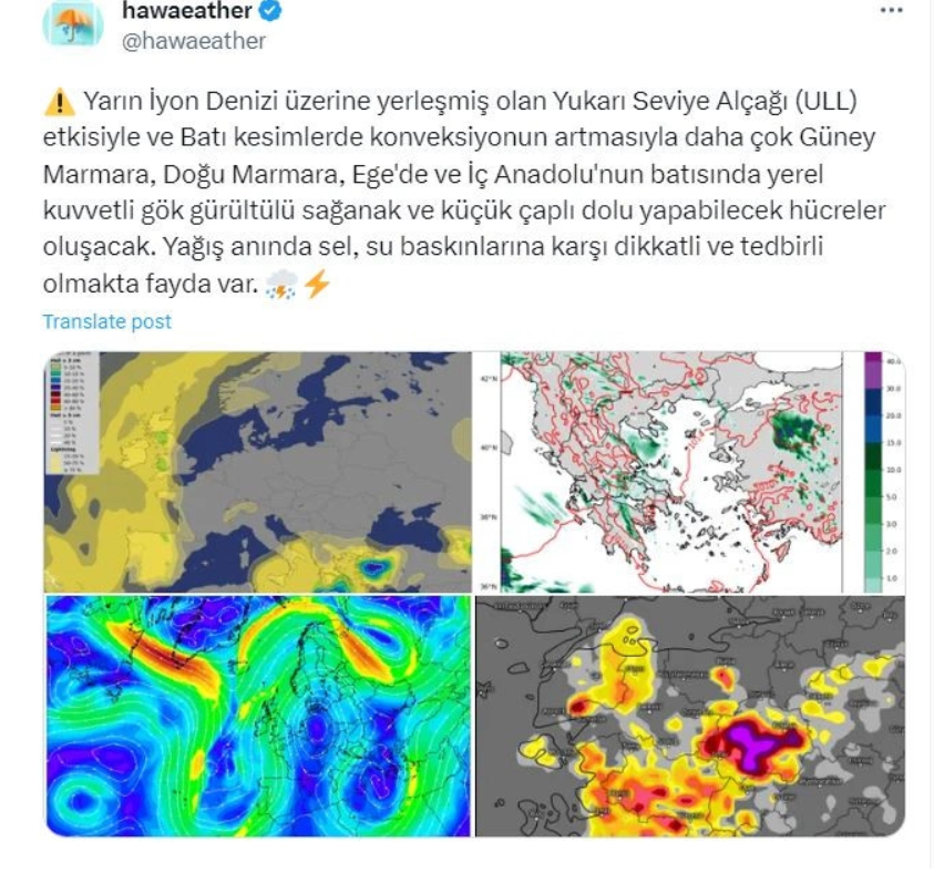 hawaeather isimli meteoroloji sitesi, yaptığı paylaşımda şöyle dedi: “Yarın İyon Denizi üzerinde bulunan Yukarı Seviye Alçağı (ULL) nedeniyle ve Batı bölgelerde havanın kararsızlaşmasıyla birlikte özellikle Güney Marmara, Doğu Marmara, Ege ve İç Anadolu’nun batısında yer yer kuvvetli gök gürültülü sağanak ve küçük boyutlu dolu oluşabilecek hava durumu bekleniyor. Yağış esnasında sel, su baskını gibi olumsuzluklara karşı dikkatli ve tedbirli olunması gerekiyor.”