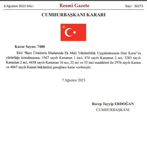 Cumhurbaşkanı Recep Tayyip Erdoğan'ın aldığı ve bugünkü Resmi Gazete’de yayımlanan kararla bazı ürünlerin ithalatına yüzde 20 ek mali yükümlülük getirildi.