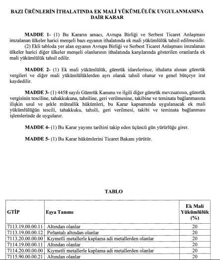 “MADDE 1- (1) Bu Kararın amacı, Avrupa Birliği ve Serbest Ticaret Anlaşması imzalanan ülkeler harici menşeli bazı eşyanın ithalatında ek mali yükümlülük tahsil edilmesidir.
