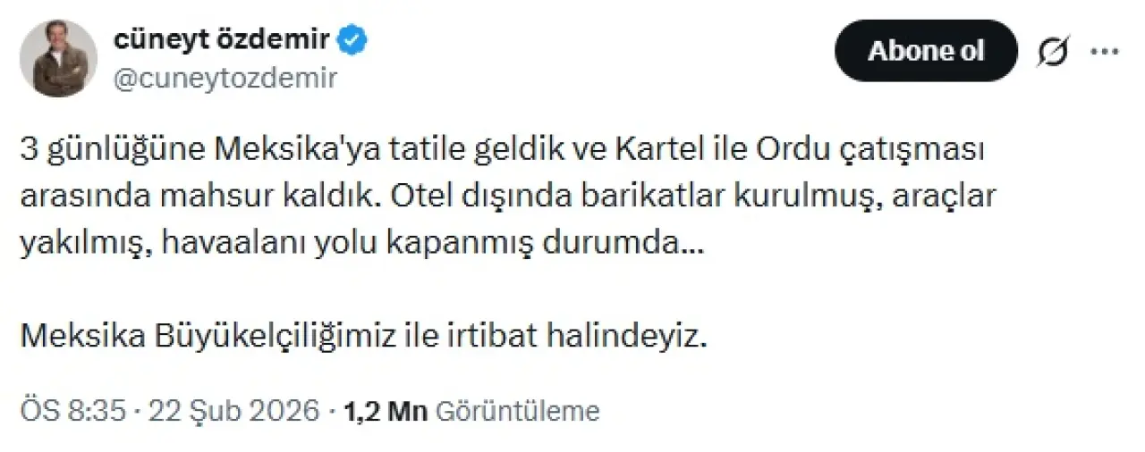 Sosyal medya platformu X hesabından da paylaşım yapan Cüneyt Özdemir, “3 günlüğüne Meksika’ya tatile geldik ve Kartel ile Ordu çatışması arasında mahsur kaldık. Otel dışında barikatlar kurulmuş, araçlar yakılmış, havaalanı yolu kapanmış durumda... Meksika Büyükelçiliğimiz ile irtibat halindeyiz.” ifadelerini kullandı.