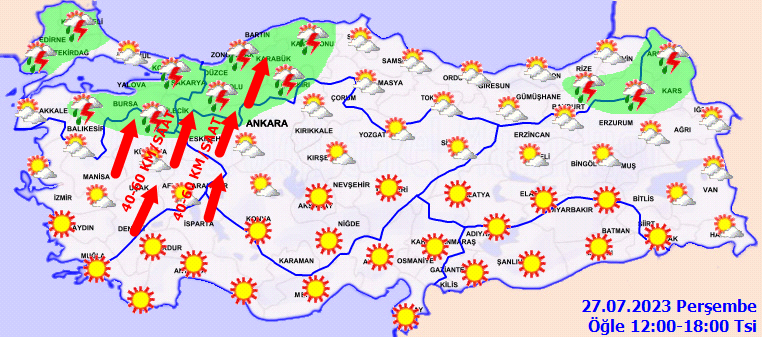 Meteoroloji Genel Müdürlüğü (MGM) tarafından yapılan son değerlendirmelere göre; ülkenin kuzey kesimlerinin parçalı, yer yer çok bulutlu, Marmaranın kuzey ve doğusu, Batı Karadeniz, İzmir, Manisa, Eskişehir, Çankırı, Kars, Ardahan, Ordu ve Giresun çevreleri ile Samsun'un doğusu, Kütahya’nın kuzey çevreleri, Ankara’nın kuzey ve batı kesimlerinin yerel olmak üzere sağanak ve yer yer gök gürültülü sağanak yağışlı, diğer yerlerin az bulutlu ve açık geçeceği tahmin ediliyor.