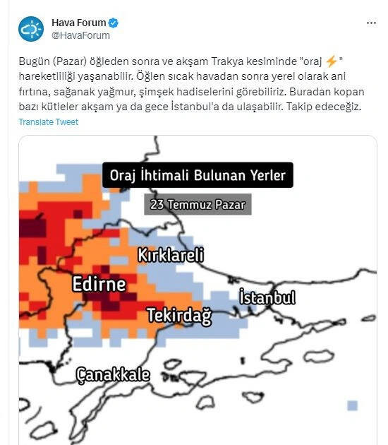 "Bugün (Pazar) öğleden sonra ve akşam Trakya kesiminde "oraj " hareketliliği yaşanabilir. Öğlen sıcak havadan sonra yerel olarak ani fırtına, sağanak yağmur, şimşek hadiselerini görebiliriz. Buradan kopan bazı kütleler akşam ya da gece İstanbul'a da ulaşabilir. Takip edeceğiz."