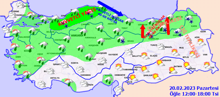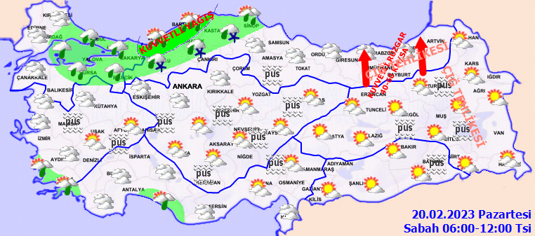 Meteoroloji Genel Müdürlüğü tarafından yapılan son değerlendirmelere göre, ülke genelinin parçalı ve çok bulutlu, Marmara’nın doğusu, Ege, İç Anadolu’nun kuzeyi, Karadeniz, Doğu Anadolu’nun kuzeyi ile Kırklareli kıyıları, Çanakkale’nin iç kesimleri, Balıkesir, Antalya’nın doğu kıyıları, Van'nın batısı, Nevşehir, Aksaray, Nevşehir, Niğde, Kayseri, Adana, Hatay, Osmaniye, Bitlis, Batman, Siirt çevreleri ve Diyarbakır'ın doğusunun aralıklı yağışlı geçeceği tahmin ediliyor. Yağışların; genellikle yağmur ve sağanak, Batı ve Doğu Karadeniz’in iç kesimleri ile Doğu Anadolu’nun kuzey kesimlerinde karla karışık yağmur ve kar şeklinde olması bekleniyor. Yağışların Batı Karadeniz ile Sakarya çevreleri, Doğu Karadeniz ile Ordu çevrelerinde yerel olmak üzere kuvvetli olacağı tahmin ediliyor. İç ve doğu kesimlerde buzlanma ve don olayı ile birlikte yer yer pus ve sis bekleniyor. Doğu Karadeniz’in iç kesimleri ile Doğu Anadolu’nun eğimli ve yüksek yamaçlarda çığ tehlikesi riski bulunmaktadır.