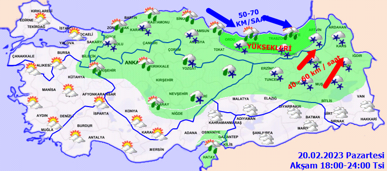 Rüzgarın güneyli, Karadeniz kıyılarında kuzeyli yönlerden Doğu Karadeniz'in iç kesimleri, Doğu Anadolu'nun kuzeyi ile Orta Karadeniz kıyılarında kuvvetli ve kısa süreli fırtına (40-70 km/sa) şeklinde eseceği beklendiğinden yaşanabilecek olumsuz şartlara karşı ulaşımda aksamalar gibi dikkatli ve tedbirli olunması gerekmektedir.