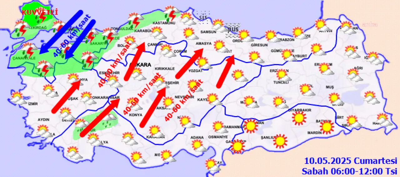 Rüzgarın, genellikle güney yönlerden hafif, ara sıra orta kuvvette, Marmara’da kuzey yönlerden iç kesimlerde güneybatı yönlerden kuvvetli (40-60 km/saat), iç Anadolu, İç Ege, Doğu Anadolu ile Batı Akdeniz ve Orta Karadeniz'in iç kesimlerinde yer yer kısa süreli fırtına şeklinde esmesi bekleniyor.
