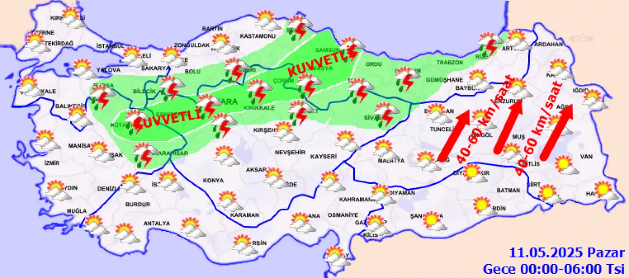 Yağışların; Batı Karadeniz’in iç kesimleri, Orta Karadeniz, Edirne, Kırklareli, Bursa, Bilecik, Kütahya, Ankara, Eskişehir, Çankırı ve Kırıkkale çevrelerinde yerel kuvvetli olması bekleniyor. Rüzgarın; Marmara’da kuzey yönlerden, İç Anadolu ile Ege, Akdeniz, Batı Karadeniz 'in iç kesimleri ile Doğu Anadolu'da güney ve güneybatı yönlerden kuvvetli (40-60 km/saat) esmesi tahmin ediliyor.