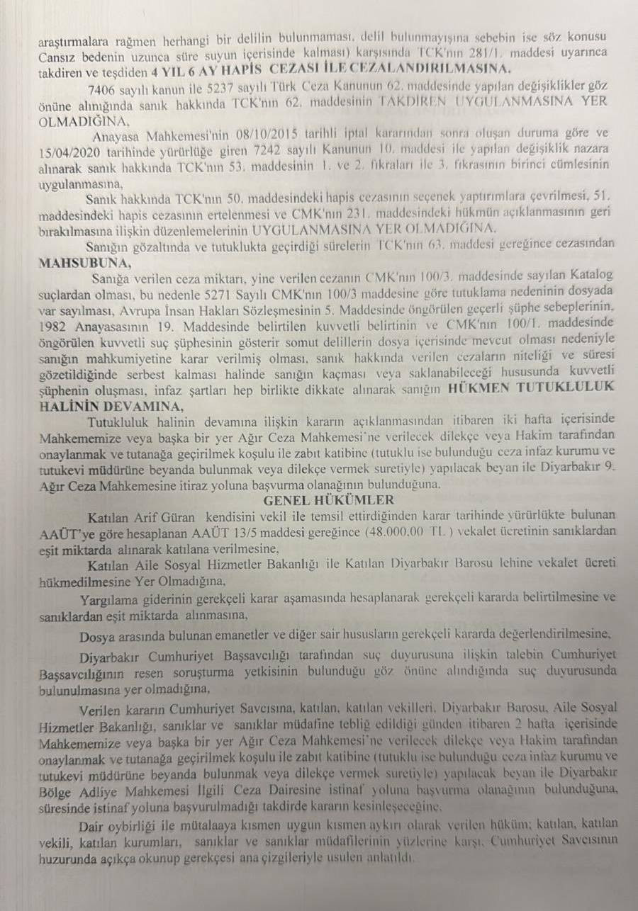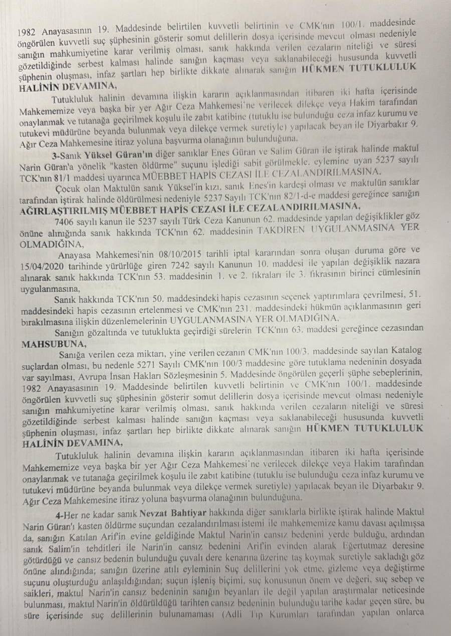 “Nevzat, Narin’i öldürmemiş olsa bile Narin’i dereye götürüp saklayan Nevzat’tır. Nevzat’ın da çocuğu öldürmekten cezalandırılması gerekirdi. Karar Nevzat boyutundan eksik kalmıştır. Diyarbakır Barosu kararı Nevzat bakımından istinaf edecek.”