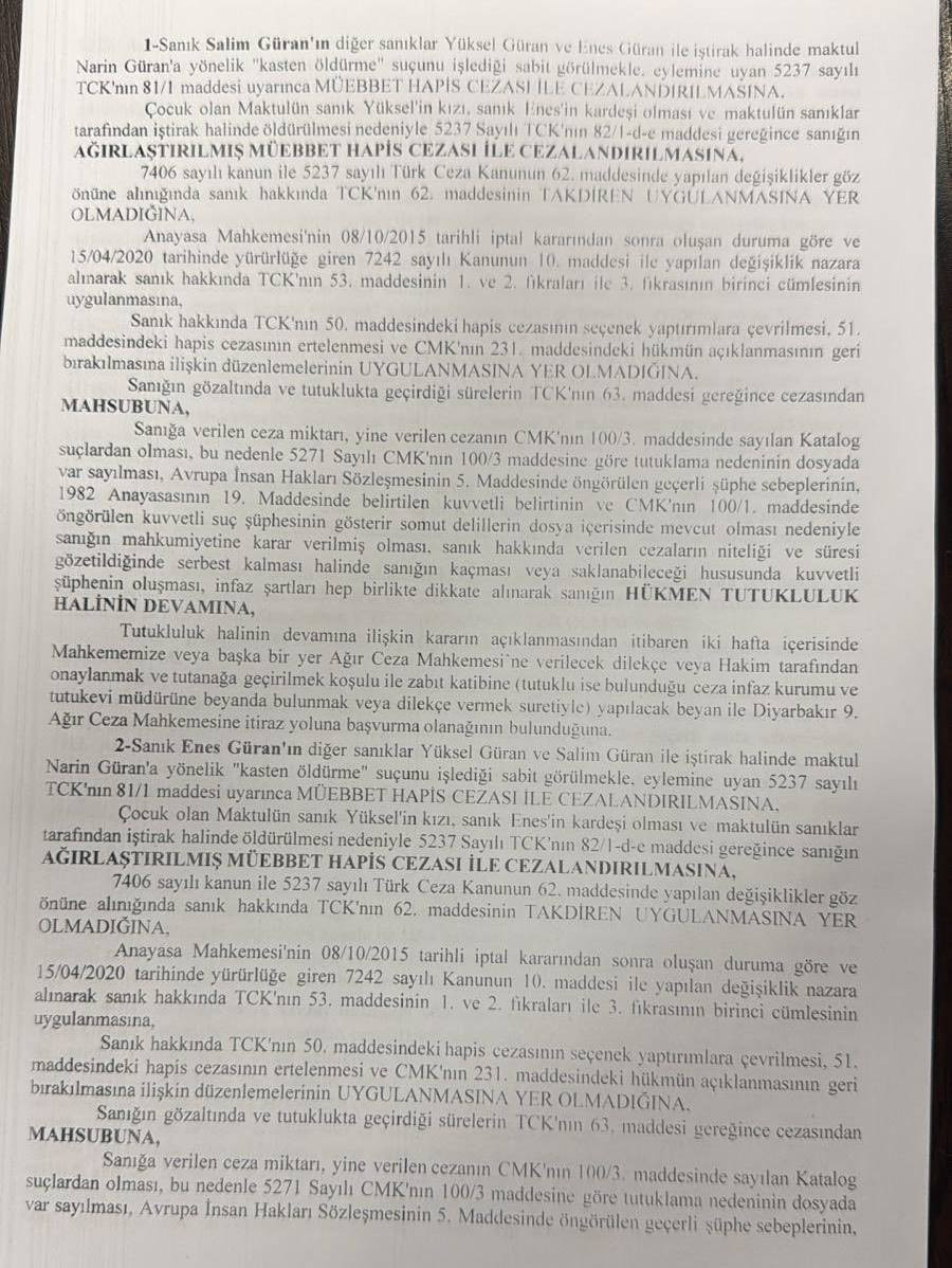 Mahkeme heyeti, "iştirak halinde çocuğa karşı kasten öldürme" suçundan tutuklu sanıklar anne Yüksel Güran, ağabey Enes Güran ve amca Salim Güran'ın Türk Ceza Kanunu'nun 37/1, 82/1-d, e, 53/1 ve 63. sevk maddeleri uyarınca ayrı ayrı ağırlaştırılmış müebbet hapis ile cezalandırılmalarına karar verdi.