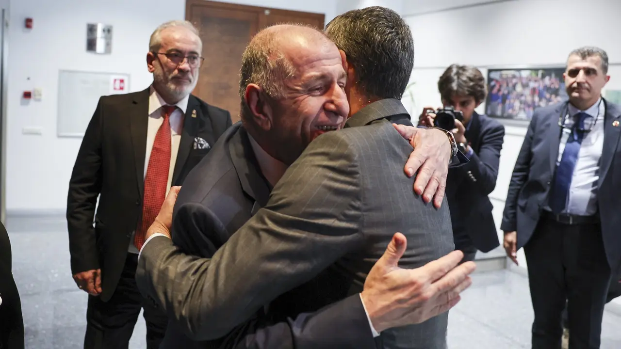 Özgür Özel, tahliye olan Ümit Özdağ'ı genel merkezde kucaklayarak karşıladı.