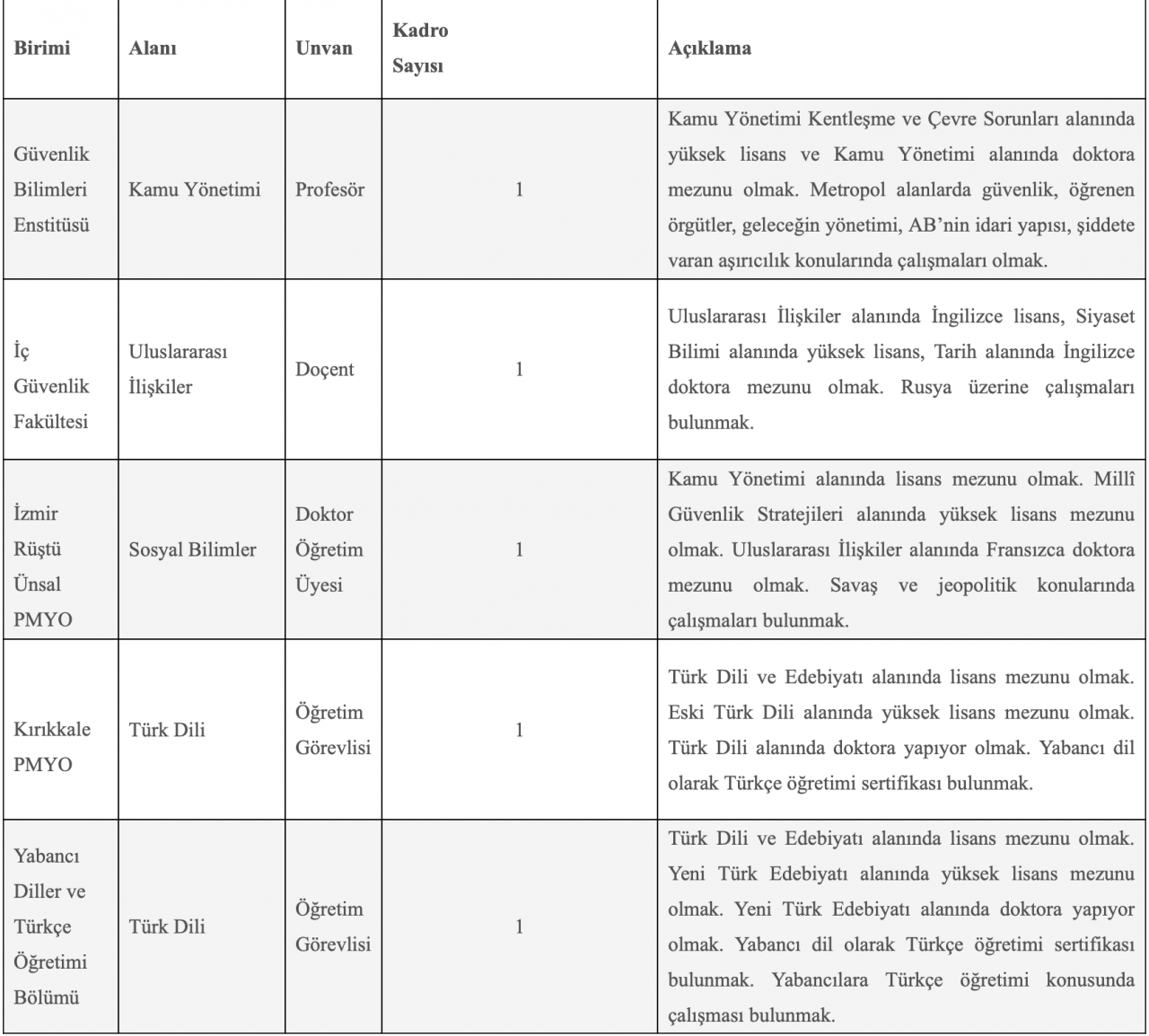 Polis Akademisi, Öğretim Elemanı alımı için Profesör (1), Doçent (1), Doktor Öğretim Üyesi (1) ve Öğretim Görevlisi (2) unvanlarında naklen veya açıktan atama yapacak. Başvuru süreci ve adaylarda aranan şartlar hakkında detaylı bilgilendirmeler yapıldı.