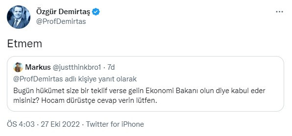 Prof. Dr. Özgür Demirtaş'a bir takipçisinin sorduğu "Bugün hükümet size bir teklif verse gelin Ekonomi Bakanı olun diye kabul eder misiniz? Hocam dürüstçe cevap verin lütfen." yanıtına "Etmem" yanıtı verdi.