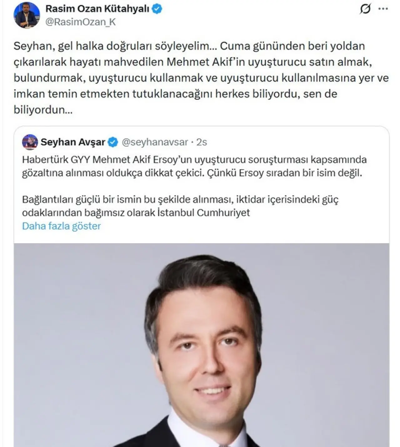 Habertürk Genel Yayın Yönetmeni Mehmet Akif Ersoy'un uyuşturucu operasyonunda gözaltına alınması gündemi sarsarken, gazeteci Rasim Ozan Kütahyalı'dan çok konuşulacak açıklamalar geldi. Ersoy'un “bataklığa itildiğini” savunan Kütahyalı, “O bu işin küçük bir parçası, soruşturmada çok daha büyük isimler var” diyerek operasyonun büyüyeceğine işaret etti.