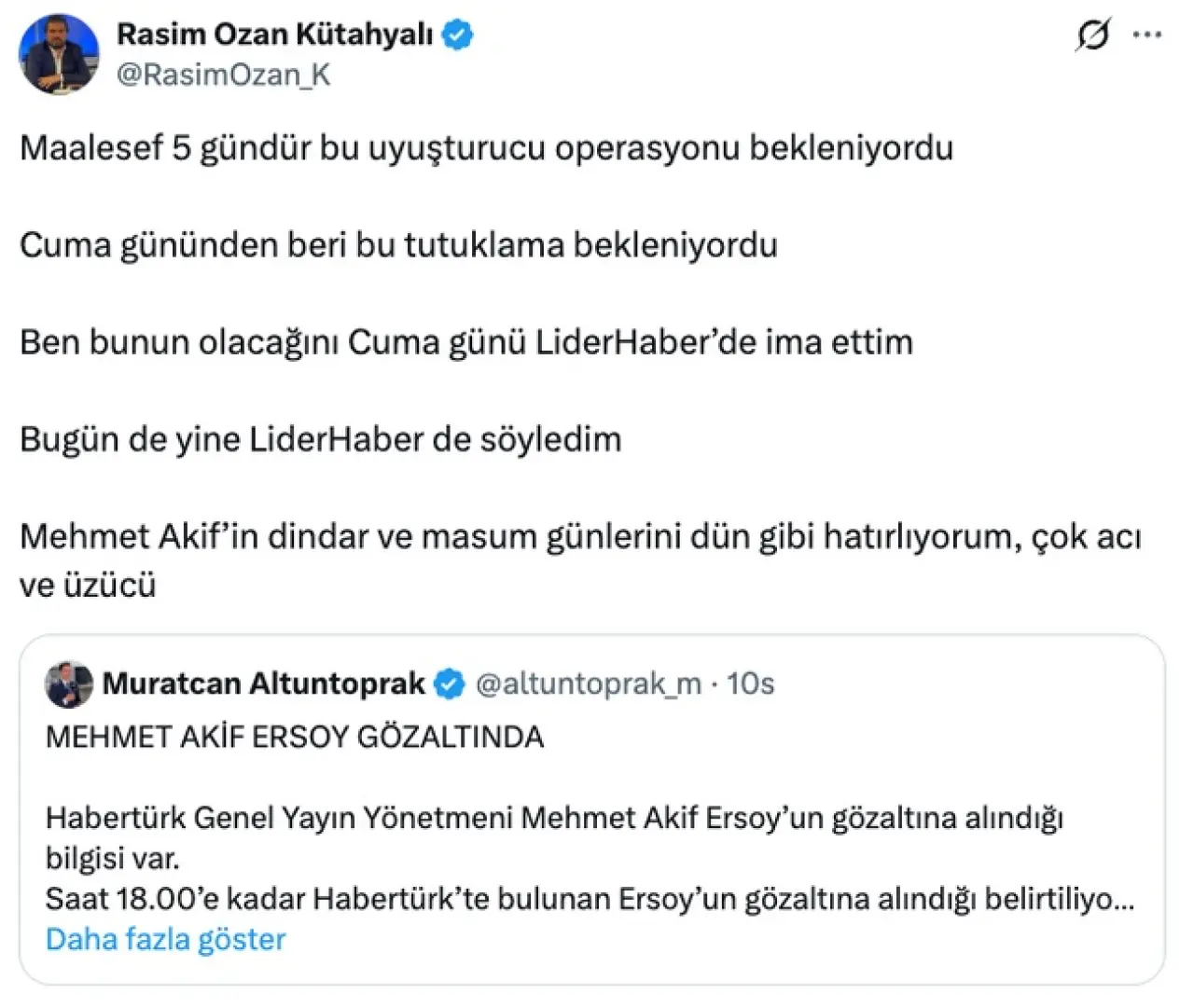 “Maalesef 5 gündür bu uyuşturucu operasyonu bekleniyordu. Cuma gününden beri bu tutuklama bekleniyordu. Ben bunun olacağını cuma günü LiderHaber’de ima ettim. Bugün de yine LiderHaber’de söyledim. Mehmet Akif’in dindar ve masum günlerini dün gibi hatırlıyorum, çok acı ve üzücü.”
