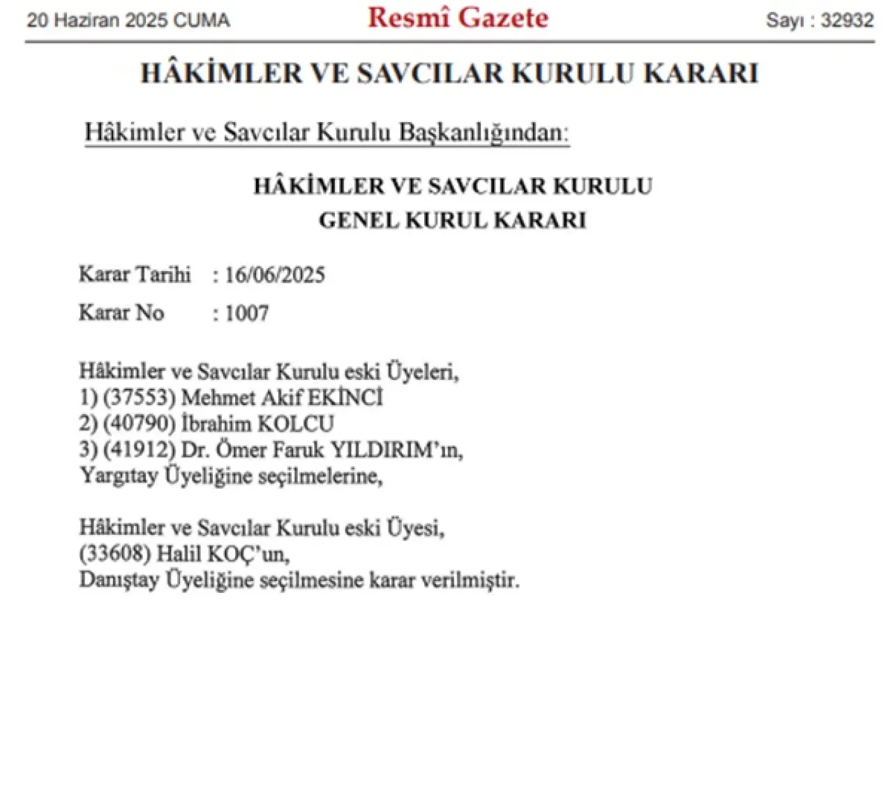 HSK tarafından yapılan Yargıtay ve Danıştay üyeliklerine seçilenler hakkında karar, 20 Haziran 2025 Tarihli ve 32932 Sayılı Resmi Gazete’de yayımlandı.