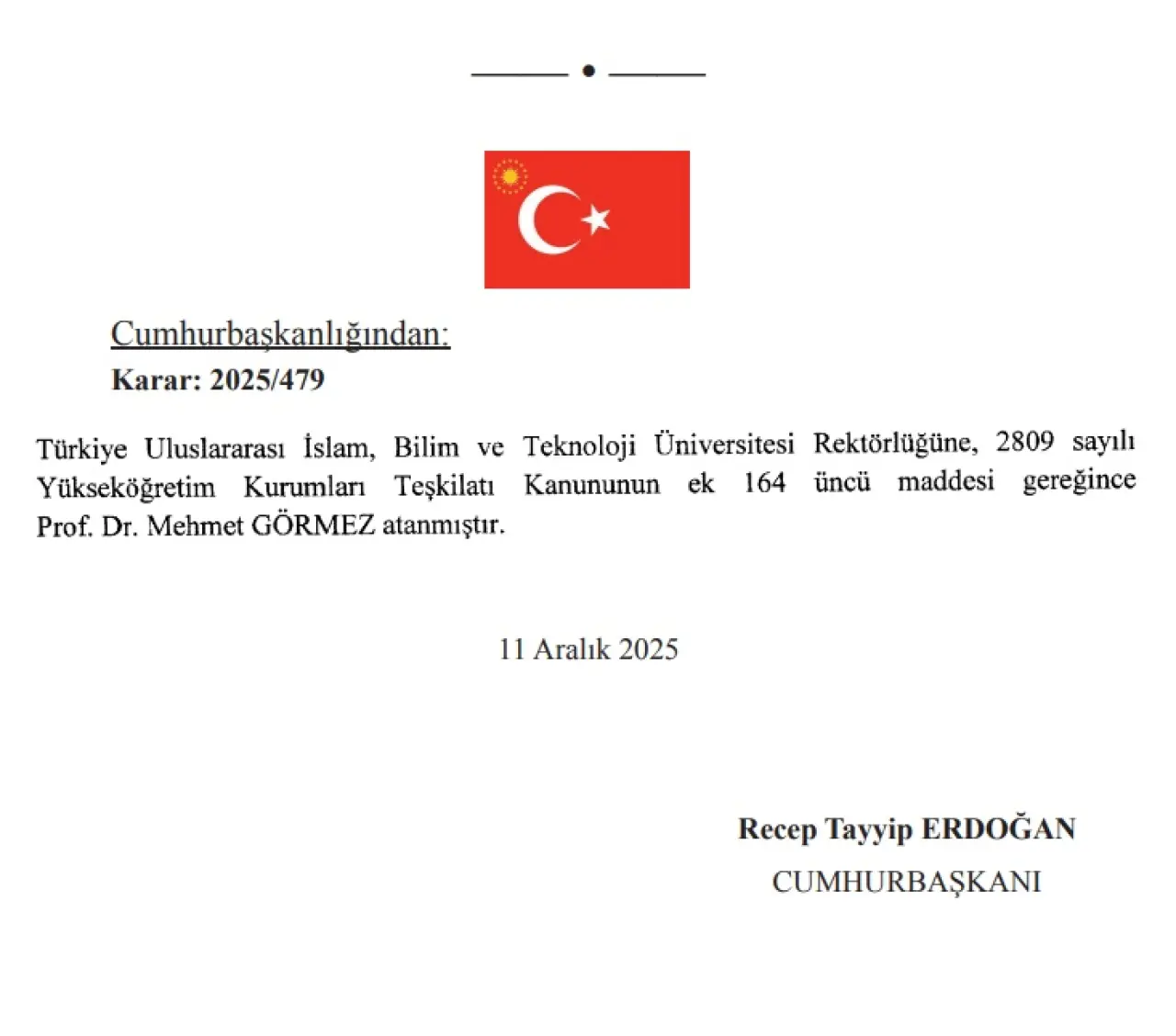 12 Aralık 2025 Tarihli ve 33105 Sayılı Resmi Gazete'de yer alan Cumhurbaşkanı kararına göre, 9 üniversitenin akademik yönetim kadrolarında değişiklikler yapıldı. Atama listesinde eski Diyanet İşleri Başkanı Prof. Dr. Mehmet Görmez'in Türkiye Uluslararası İslam, Bilim ve Teknoloji Üniversitesi Rektörlüğüne getirilmesi en dikkat çeken detay oldu.