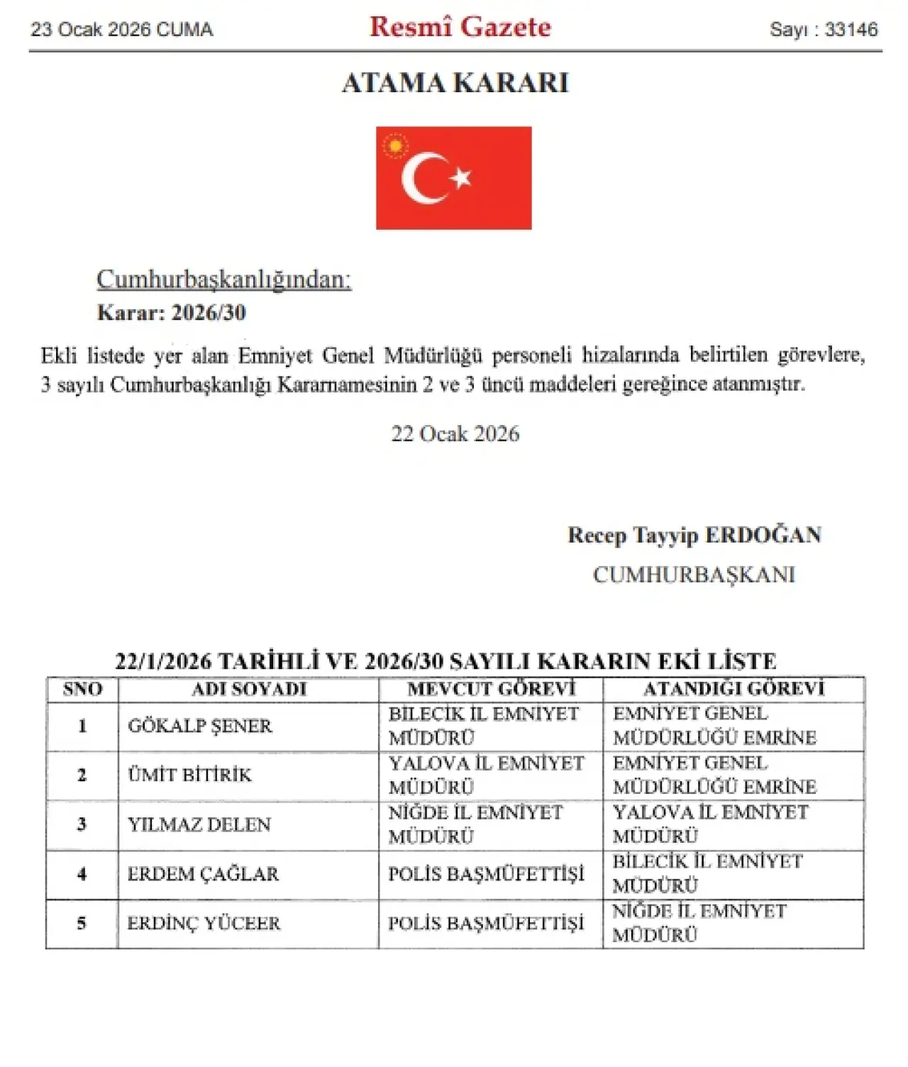 Cumhurbaşkanlığı tarafından yapılan yeni atama kararları 23 Ocak 2026 Tarihli ve 33146 Sayılı Resmi Gazete’de yayımlanarak yürürlüğe girdi. Karar kapsamında üç ilin emniyet müdürlüğü koltuğuna yeni isimler getirildi.